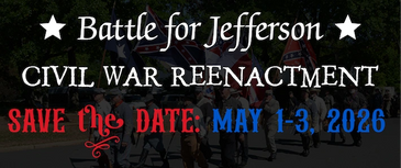 Hundreds of Civil War period re-enactors - soldiers and civilians both - are expected to descend upon the town the weekend of May 1st, 2nd, and 3rd 2026 to enact "The Battle for Jefferson," a two-day tilt between Confederate and Federal forces. Infantry, cavalry and artillery all play a part in the scenario battle that gives life to what might have happened in and around Jefferson in 1864 had Union Troops been successful in the Red River Campaign and captured Shreveport.